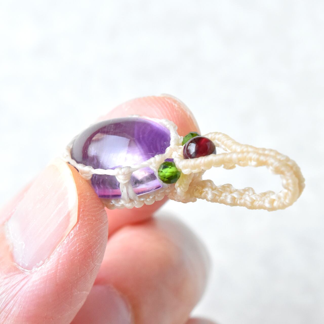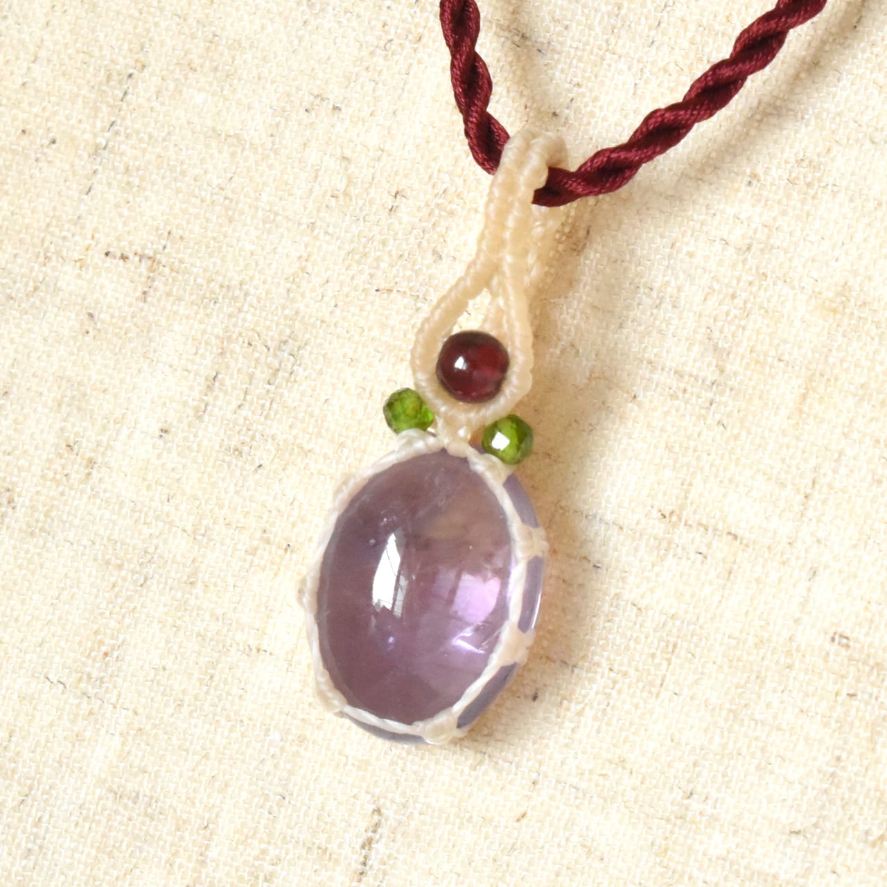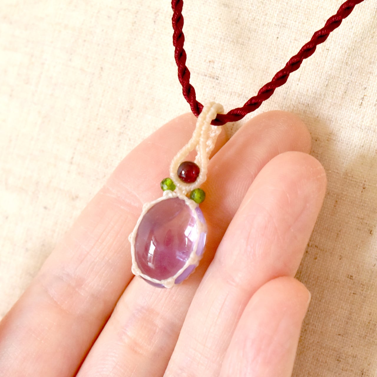 アメシストのマクラメ編みペンダント・シルク首紐・金属アレルギー対応【セフィラ −天のしずく−】シリーズ