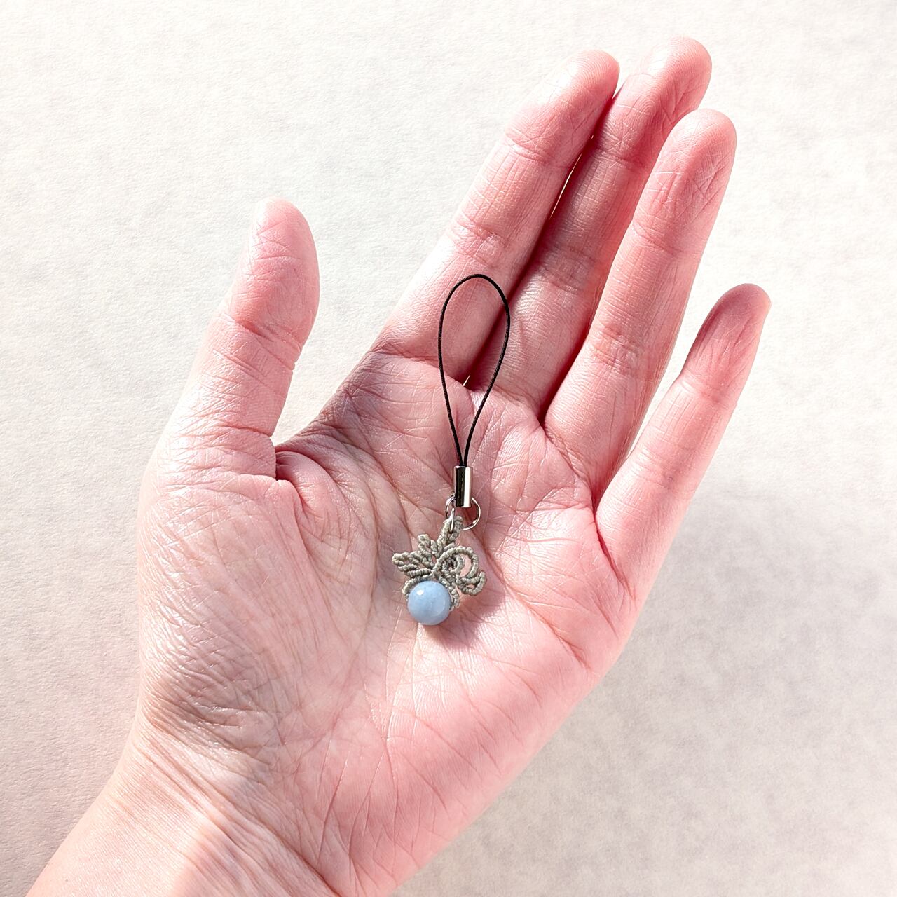 落ち着きのある水色のエンジェライトに、灰色の紐で繊細なマクラメ装飾を施した、お守りチャームストラップです。